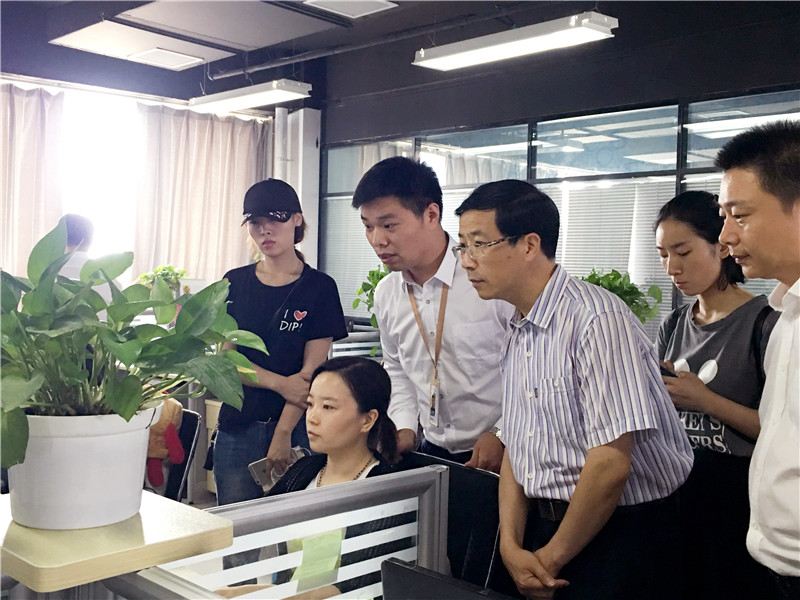 星空总部,我公司人资总监与业务主管陪同万副市长及各位领导一同参观公司内部,并且将介绍了公司各部门职能与工作内容。